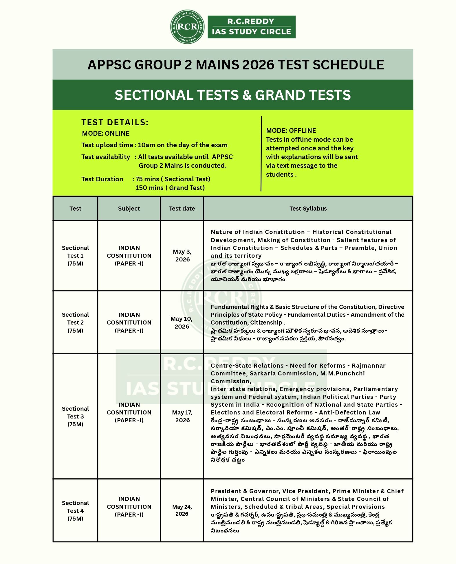 Prepare for the APPSC Group 2 Mains with a structured approach by systematically practicing the complete syllabus through a well-planned test schedule.